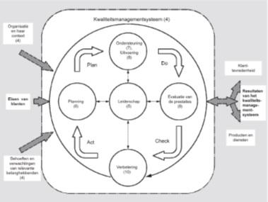 In de ISO norm word gesproken over het managementsysteem met hierin de plan-do-check-act cyclus. Elke onderdeel is opgebouwd uit de verschillende elementen. En de gehele cyclus heeft een aantal aanvullende in-puts.